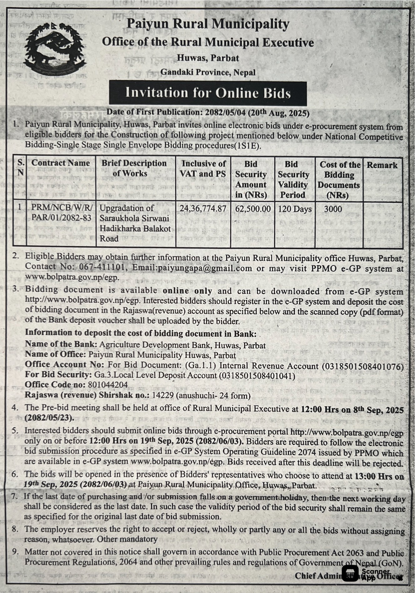 | 20 | Myagde Rural Municipality | Construction of Landfill and Access Road at Myagde Rural Municipality-2, Tanahun | 19/08/2025 | PPMO | 18/09/2025 | Click Here | |