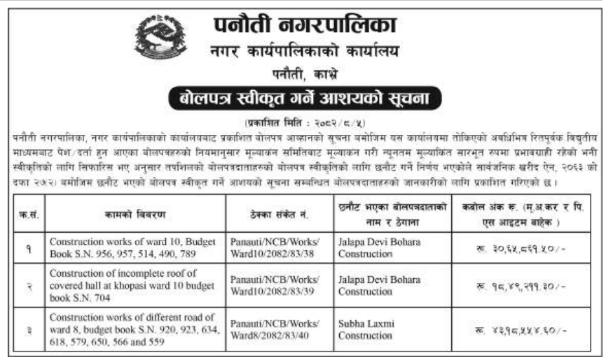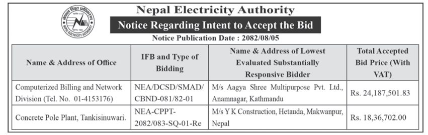 बोलपत्र स्विकृत ; Bid Award (Construction only) 21/11/2025 (Friday)