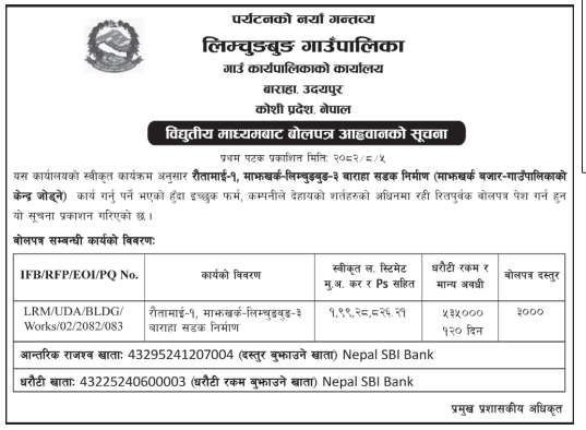 200 Urban Development and Building Office, Rolpa Sela Bajher Pachkhai Samma Sahari Bikas Lungri-03,Rolpa 20/11/2025 PPMO 05/12/2025 Click Here