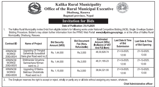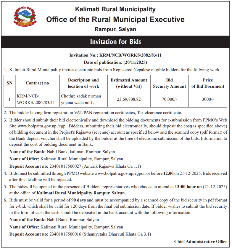 68 Kalimati Rural Municipality, Salyan Chothre sadak Nirman Yojana 20/11/2025 PPMO 21/12/2025 Click Here