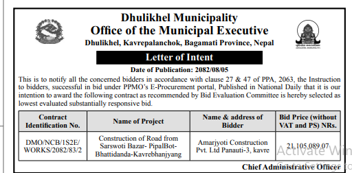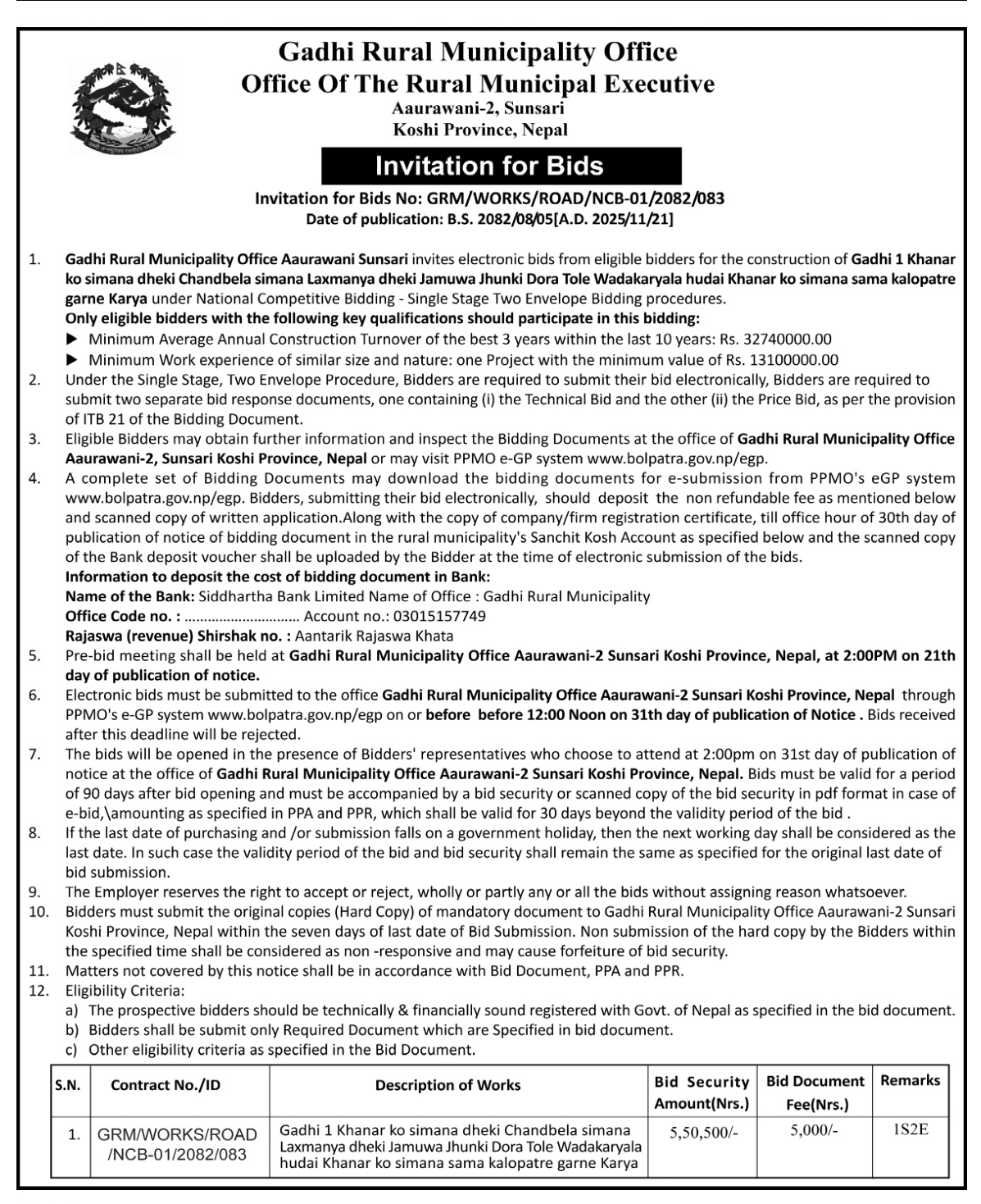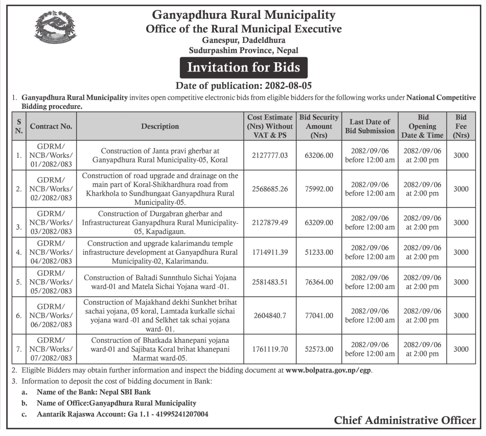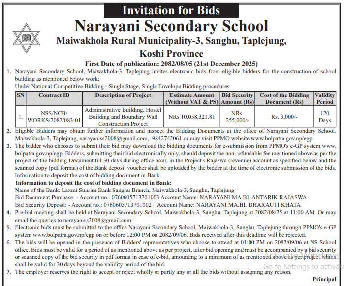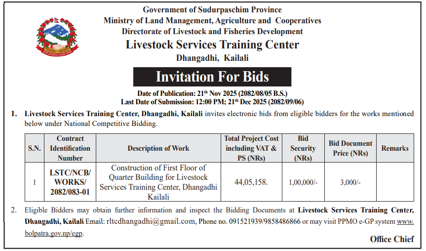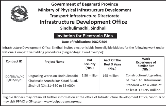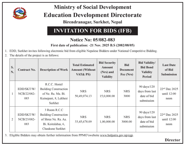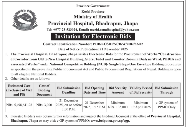 61 Infrastructure Development Office, Bhojpur Construction of Class Room Building at Shree Siddheswar Secondary School 20/11/2025 PPMO 21/12/2025 Click Here