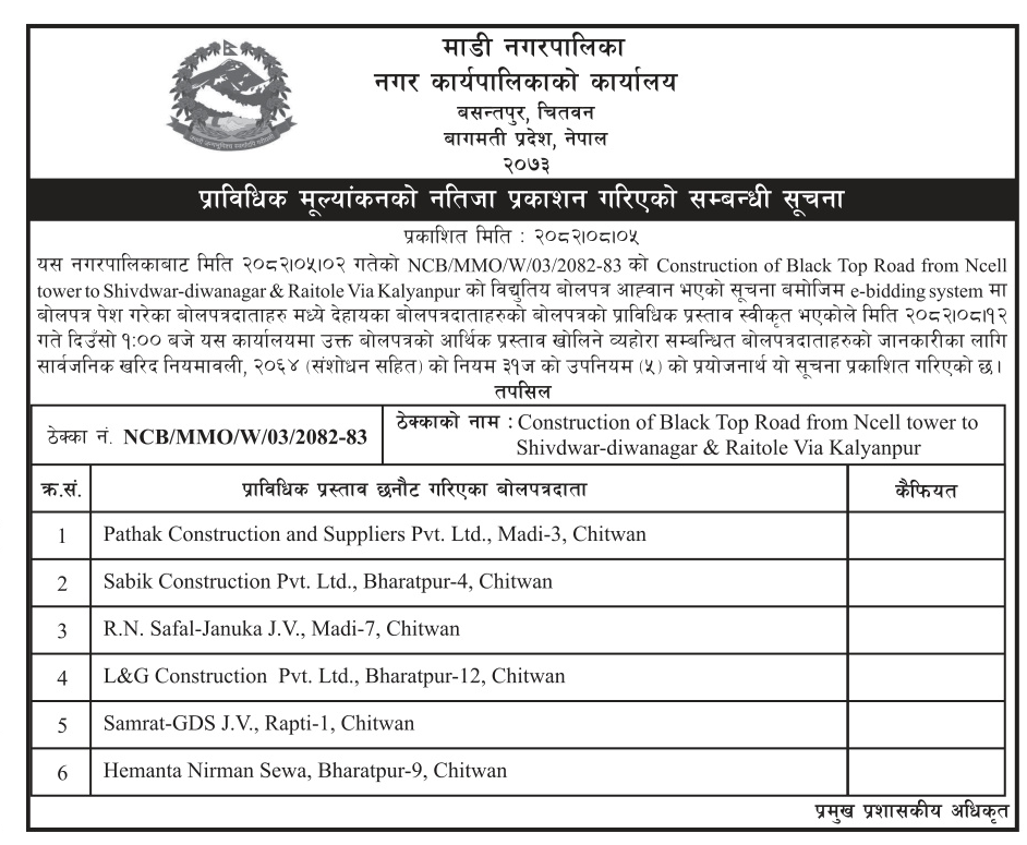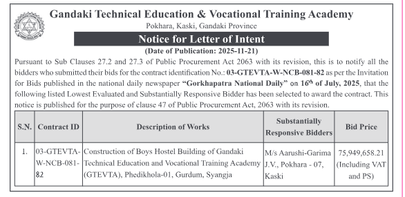 प्रदेश ४ मा प्रकाशित निर्माण सम्बन्धी बोलपत्र तथा आशयका सुचनाहरु