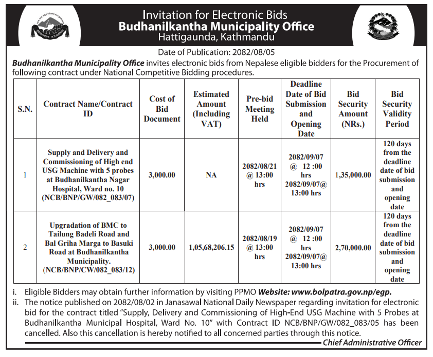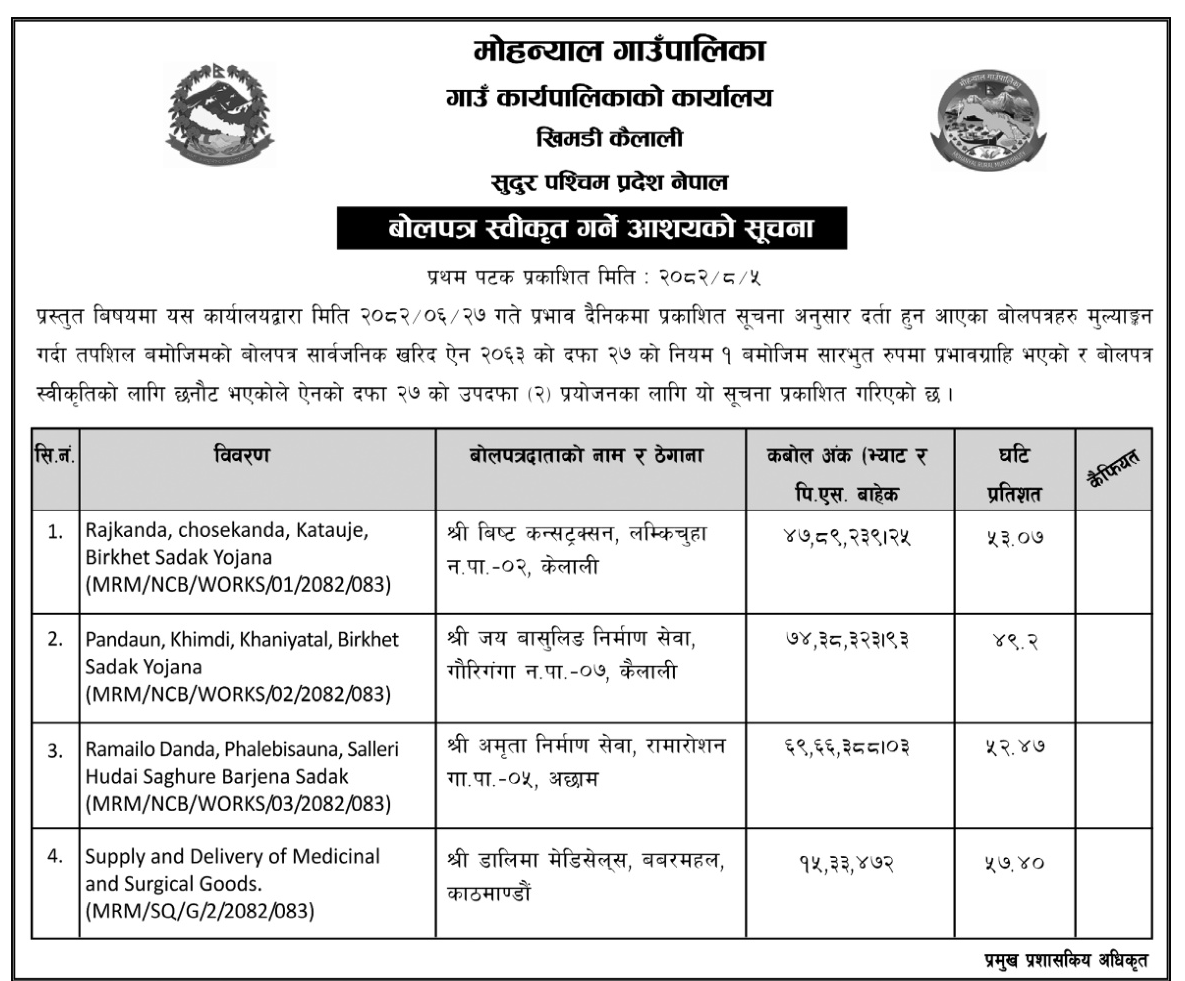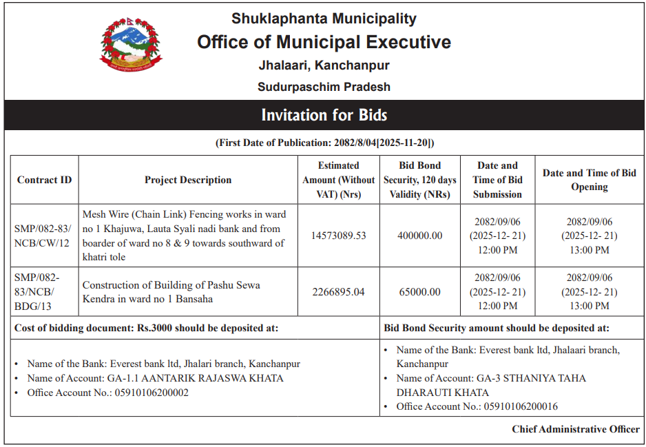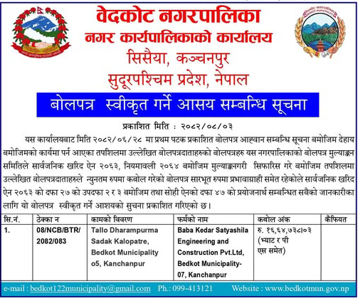 220 Bedkot Municipality, Kanchanpur Procurement of Medical Items for Bedkot Municipality Branches 20/11/2025 PPMO 21/12/2025 Click Here