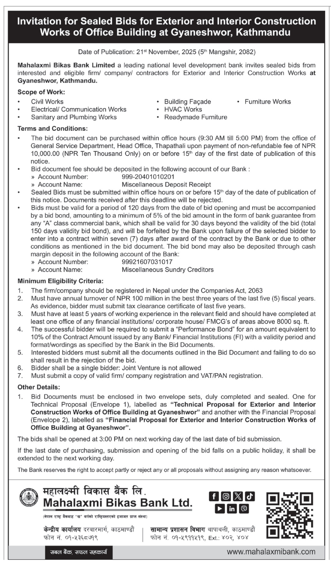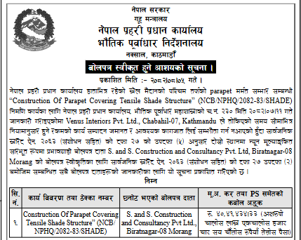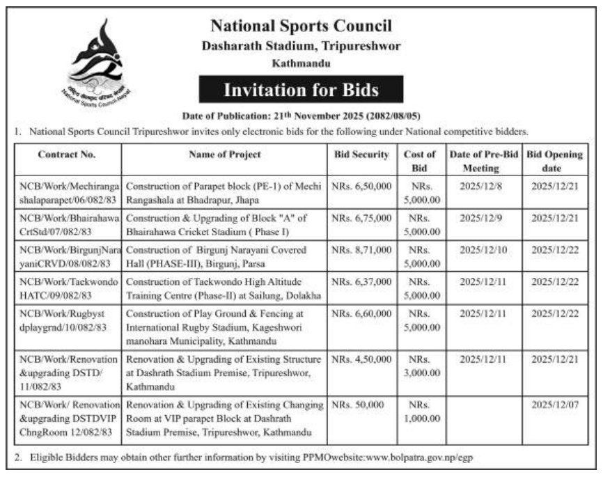 17 National Sports Council Construction of Birgunj Narayani Covered Hall(Phase-III), Birgunj, Parsa 20/11/2025 PPMO 22/12/2025 Click Here