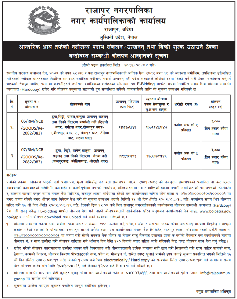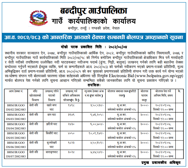 3 Bandipur Rural Municipality Extraction of River Bed Materials from Seti River, Jhaterni Ghat 20/11/2025 PPMO 22/12/2025 Click Here