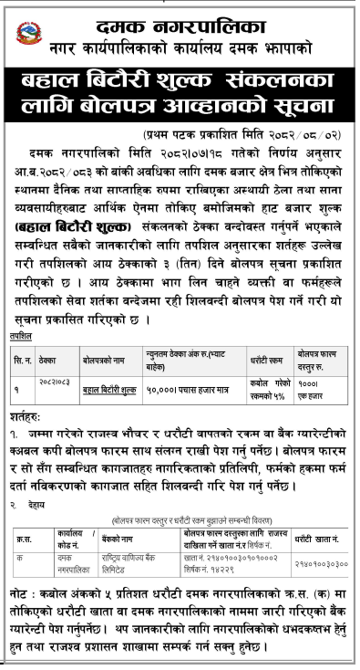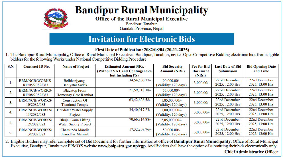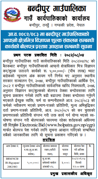 7 Bandipur Rural Municipality Bandipur Gaunpalika ko aaphno chhetra bhitra bigyapan shulka sankalan sambandhi karyako bolpatra prastab 20/11/2025 PPMO 22/12/2025 Click Here