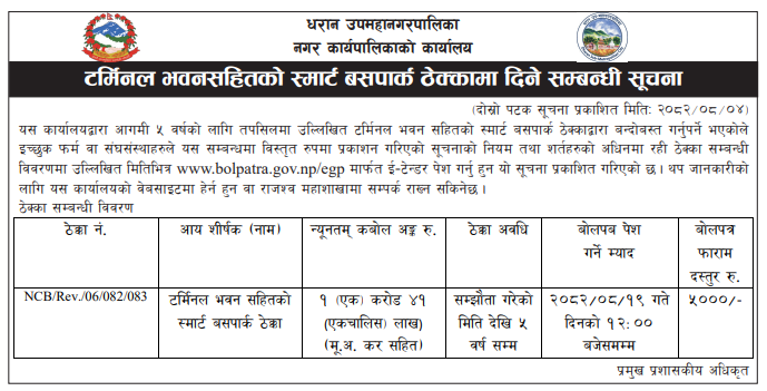 184 Dharan Sub- Metropolitan City Office, Dharan Dharan Smart buspark including terminal building management and rental works. 20/11/2025 PPMO 05/12/2025 Click Here