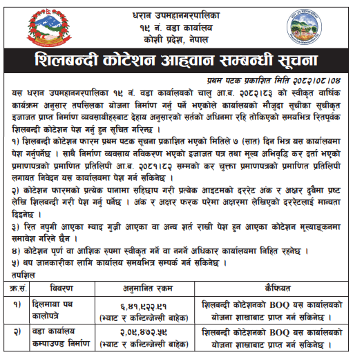 22 Dhanapalthan Rural Municipality, Sorabhag, Morang Dhanpalthan-4 Beni aabi dekhi gadiya khola sabik kadmaha-3 hudai dhanpalthan-6 pindeshor aabi sama sadak kalopatra 20/11/2025 PPMO 21/12/2025 Click Here