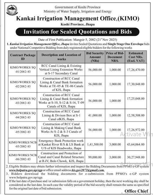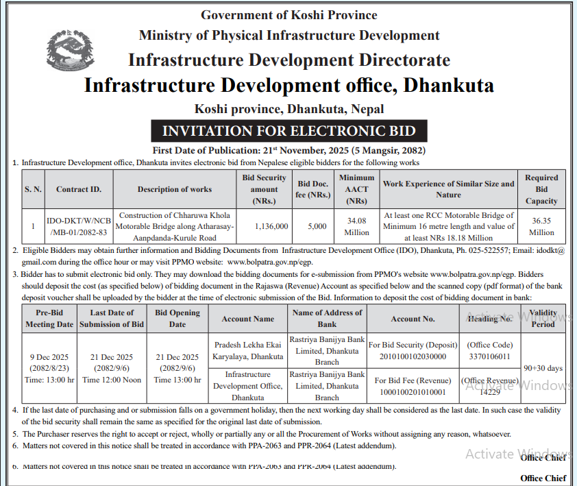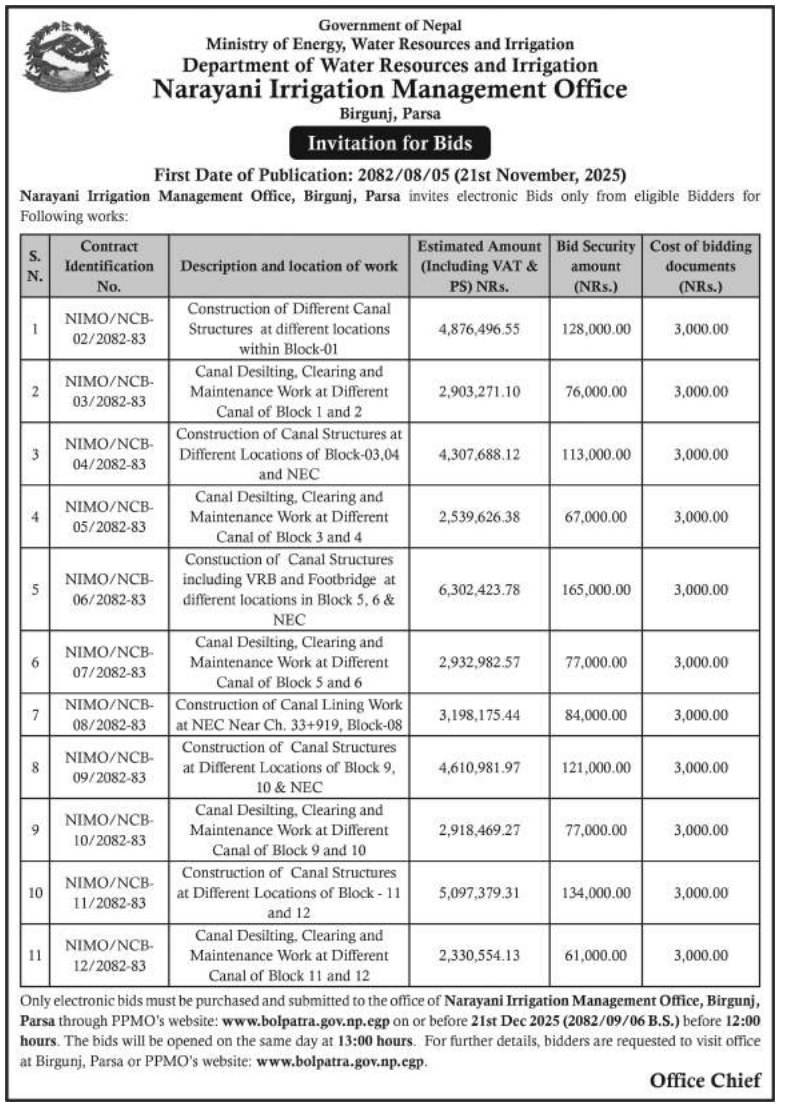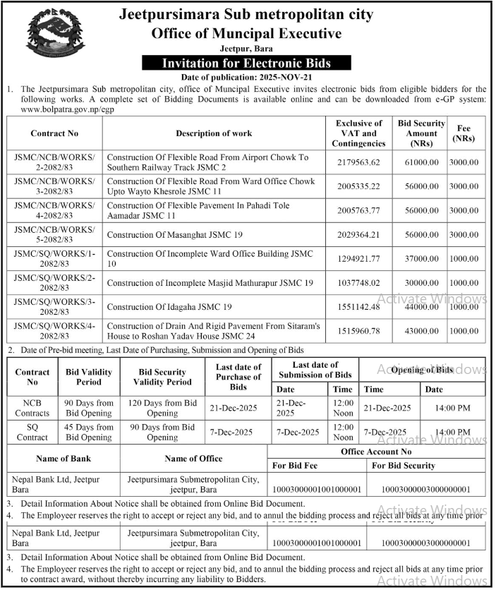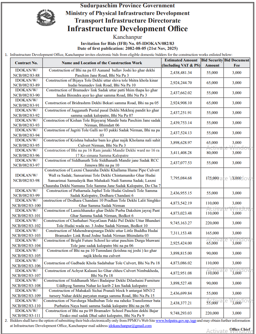 निर्माण सम्बन्धी प्रकाशित सम्पूर्ण ठेक्का टेन्डर तथा बोलपत्र सुचनाहरु प्रदेश अनुसार 21/11/2025 (Friday)
