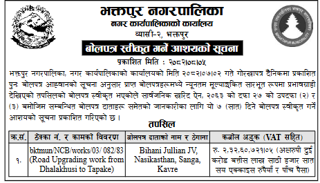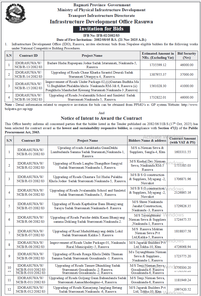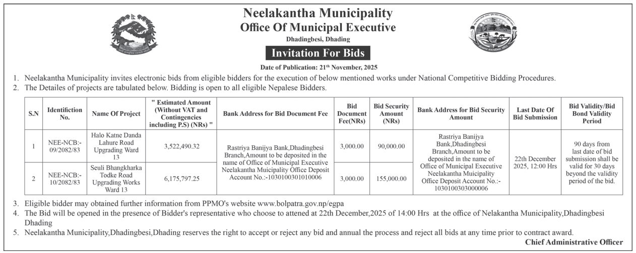 31 Bidur Municipality,Nuwakot Bhitri Taar Pallo Taar Sadak Staronnati Karya, Bidur 7, Nuwakot 20/11/2025 PPMO 21/12/2025 Click Here