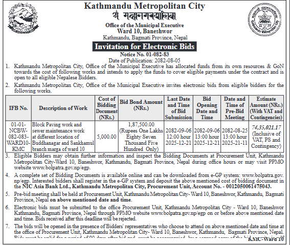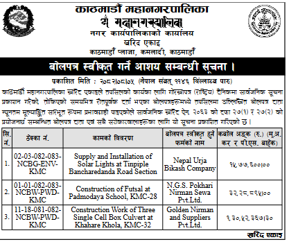 25 KMC Public Works Department Construction of Toilet and Boundary Wall at Gurunaanak Mahadev, KMC-16 20/11/2025 PPMO 21/12/2025 Click Here