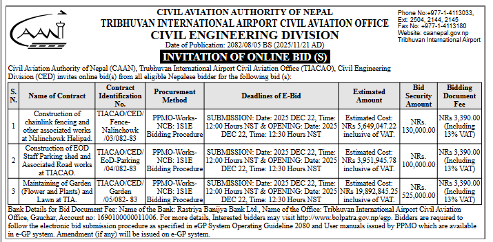 216 GrSD(Ground Support Department), Nepal Airlines Corporation The Procurement of Operation Control System Module for NAC-GSP (2nd Re-Tender) 20/11/2025 PPMO 22/12/2025 Click Here