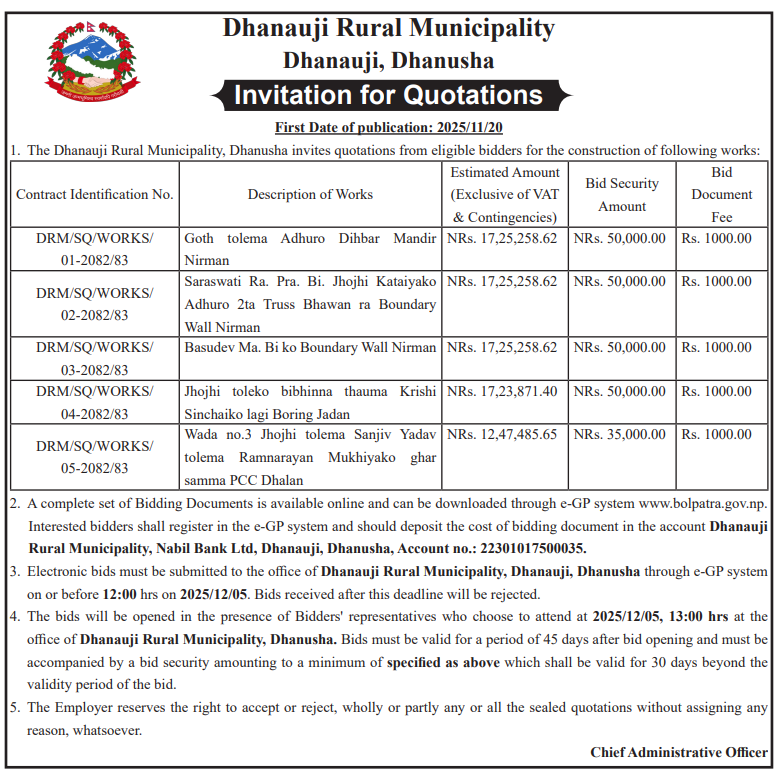 171 Dhanauji Rural Municipality Basudev Ma. Bi. ko Boundary Wall Nirman 20/11/2025 PPMO 05/12/2025 Click Here