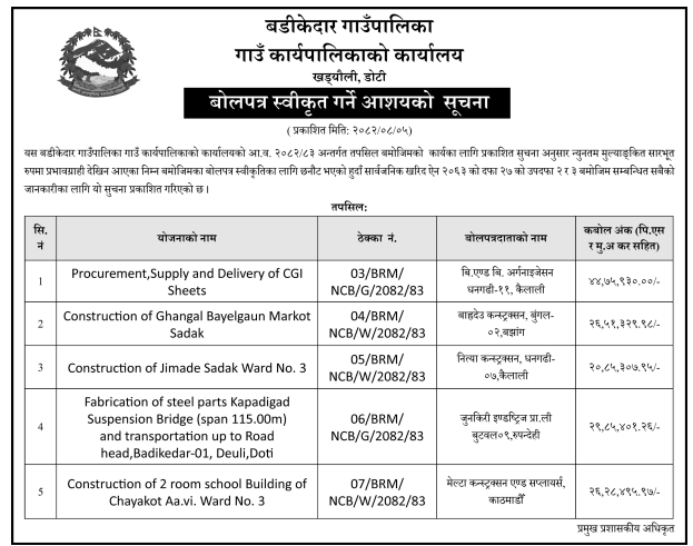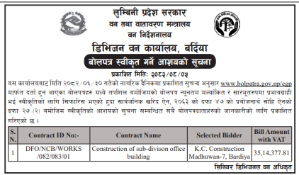 प्रदेश ७ मा प्रकाशित निर्माण सम्बन्धी बोलपत्र तथा आशयका सुचनाहरु