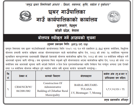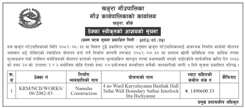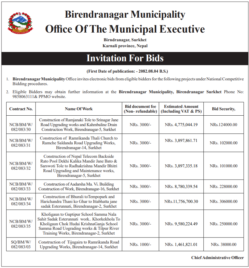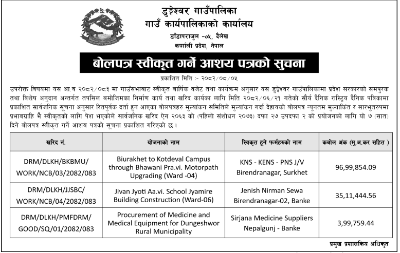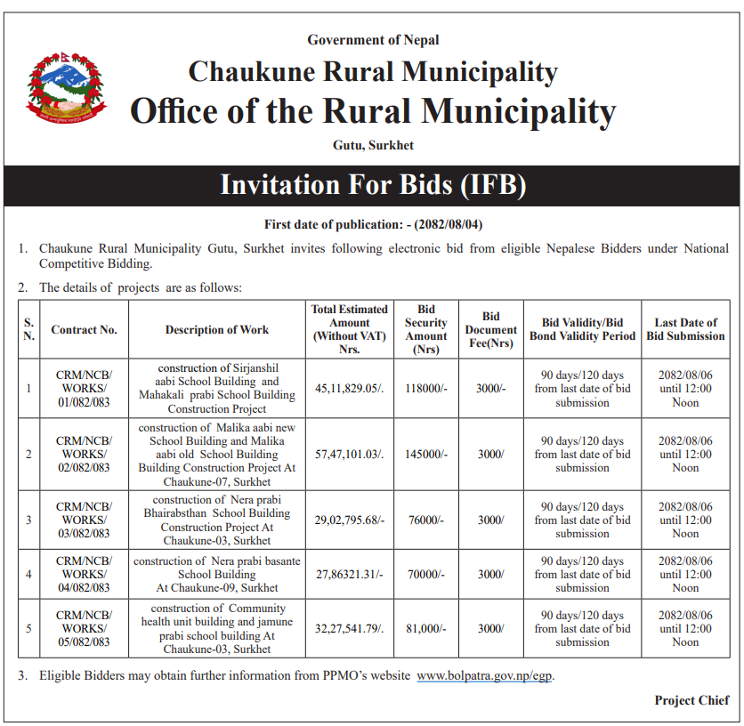 36 Chaukune Rural Municipality, Surkhet Nera Pra.Bi Basante Bhawan Nirman 20/11/2025 PPMO 21/12/2025 Click Here