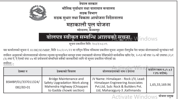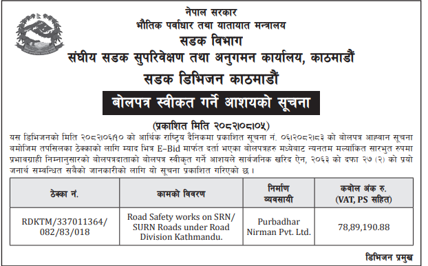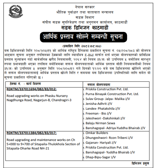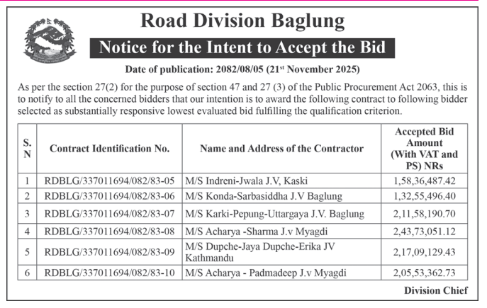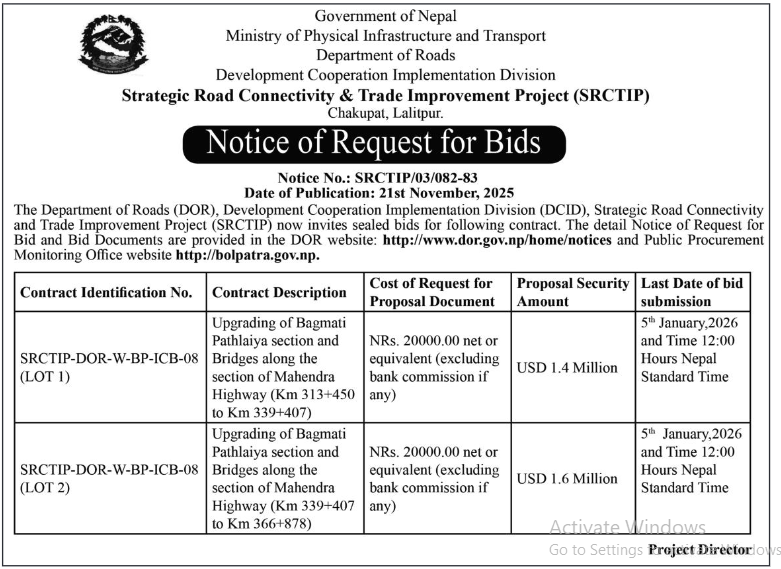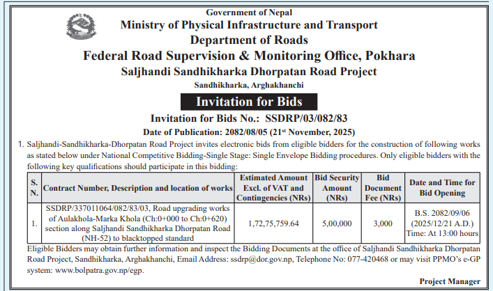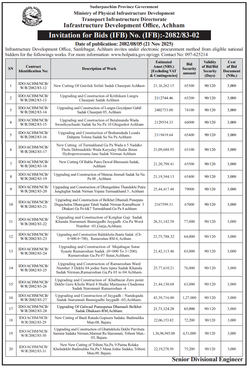 66 503 Division Road Office Baitadi Reactive Maintenance works in Anarkholi-Khodpe Section CH: 0+000-7+180 of Midhill Highway (NH-03), Khodpe–Bitthad Section CH: 0+000 -29+590 and Bitthad–Kalangagad Section CH: 29+590-60+310 of Khodpe-Chainpur Highway (NH -64). 20/11/2025 PPMO 21/12/2025 Click Here