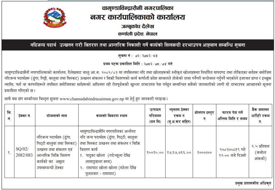 194 Triveni Rural Municipality, Salyan Excavation, Collection and sale of stones, pebbles, sand, etc. from Ghur khola, Sharda khola, Rikhe khola, and Dhungi Bagar khola. 20/11/2025 PPMO 05/12/2025 Click Here