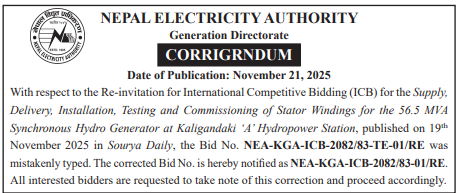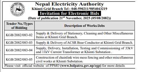 185 NEA, Humla Distribution Center Construction work of 11 KV HT Line at Different Areas of Simikot-08 Kharpunath-02 RM, Humla 20/11/2025 PPMO 05/12/2025 Click Here