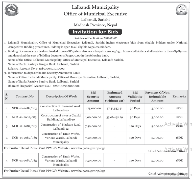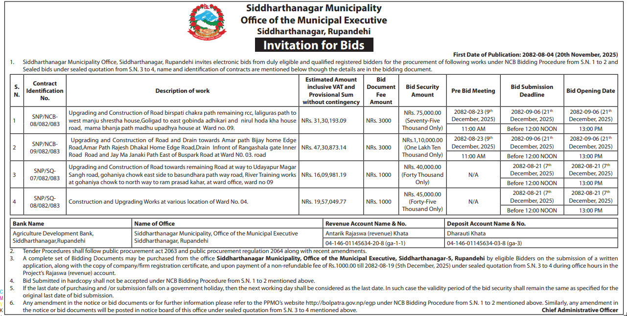 74 National Sports Council Construction & Upgrading of Block "A" of Bhairahawa Cricket Stadium ( Phase I), Bhairahawa, Rupandehi 20/11/2025 PPMO 21/12/2025 Click Here