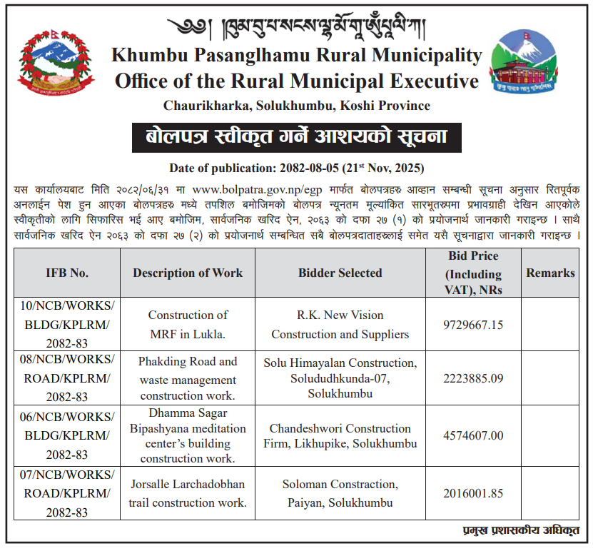 219 Khumbu Pasanglhamu Rural Municipality, Solukhumbu Procurement of Stationery and Various Office Goods in KPLRM 20/11/2025 PPMO 21/12/2025 Click Here