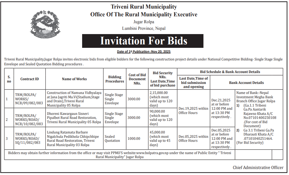 198 Urban Development and Building Office, Rolpa Sahidmarga Tila Kaule Bidhyamandir Prabi Ranagaun Nagar Hudoi Tribeni Motorbato Nirman Tribeni 07 Rolpa (Bibidh) 20/11/2025 PPMO 05/12/2025 Click Here