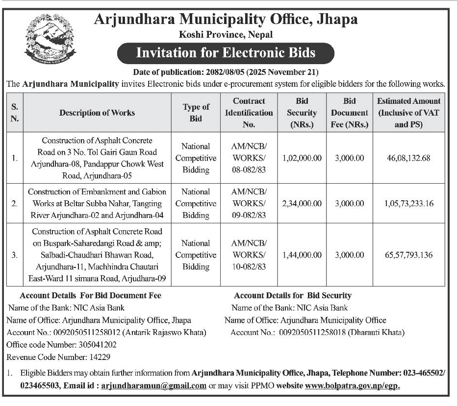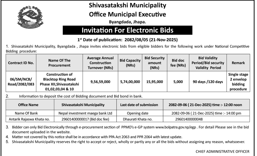 45 Infrastructure Development Office , Jhapa Upgrading works of Ringroad Kachankawal-4, Jhapa 20/11/2025 PPMO 21/12/2025 Click Here