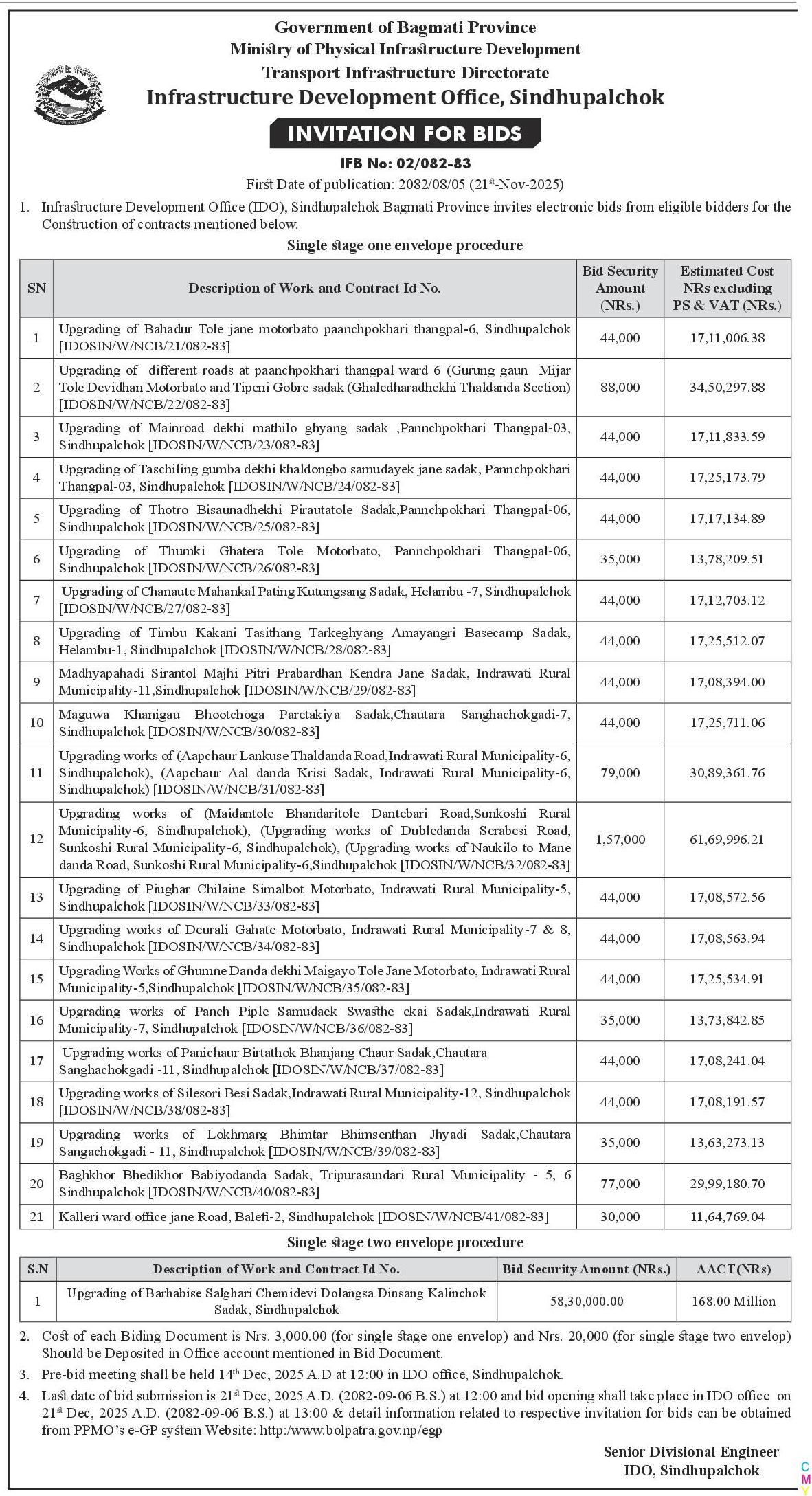 55 Infrastructure Development Office (IDO), Okhaldhunga Tanuwa-Nibhare-Khumbu Road, Khijidemba-5, Okhaldhunga 20/11/2025 PPMO 21/12/2025 Click Here