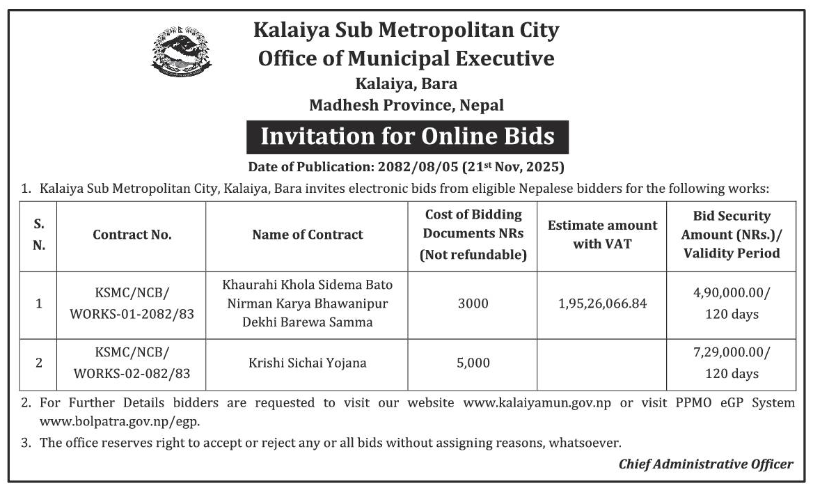 237 Birgunj Metropolitan City Supplying and Delivering of Medicinal and Surgical Items For Birgunj Metropolitan Office. 20/11/2025 PPMO 05/12/2025 Click Here
