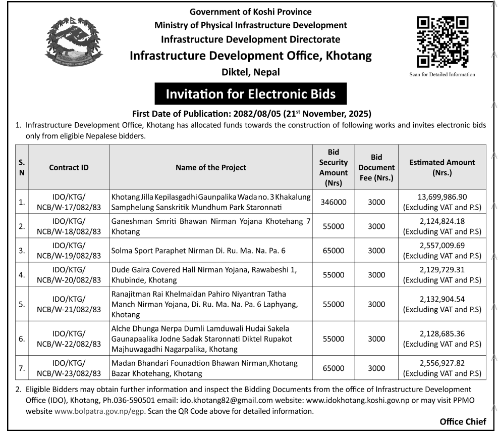 51 Infrastructure Development Office (IDO), Okhaldhunga Kuivir Sahit Smriti Samudayak Bhawan Nirman Chisankhugadi R.M-01 Okhaldhunga 20/11/2025 PPMO 21/12/2025 Click Here