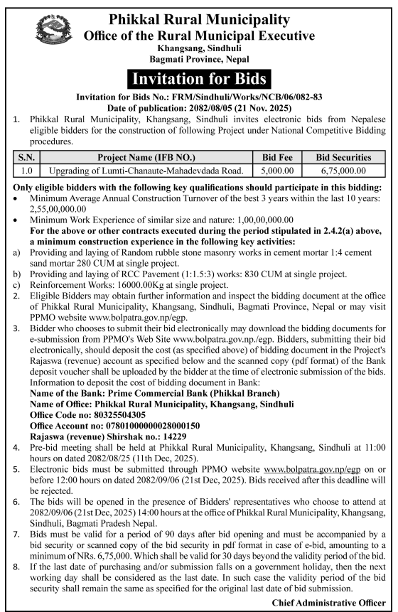 70 Mikwakhola Rural Municipality, Taplejung construction of road works handrung dandagau libang papung kalopatre suruwat 20/11/2025 PPMO 21/12/2025 Click Here