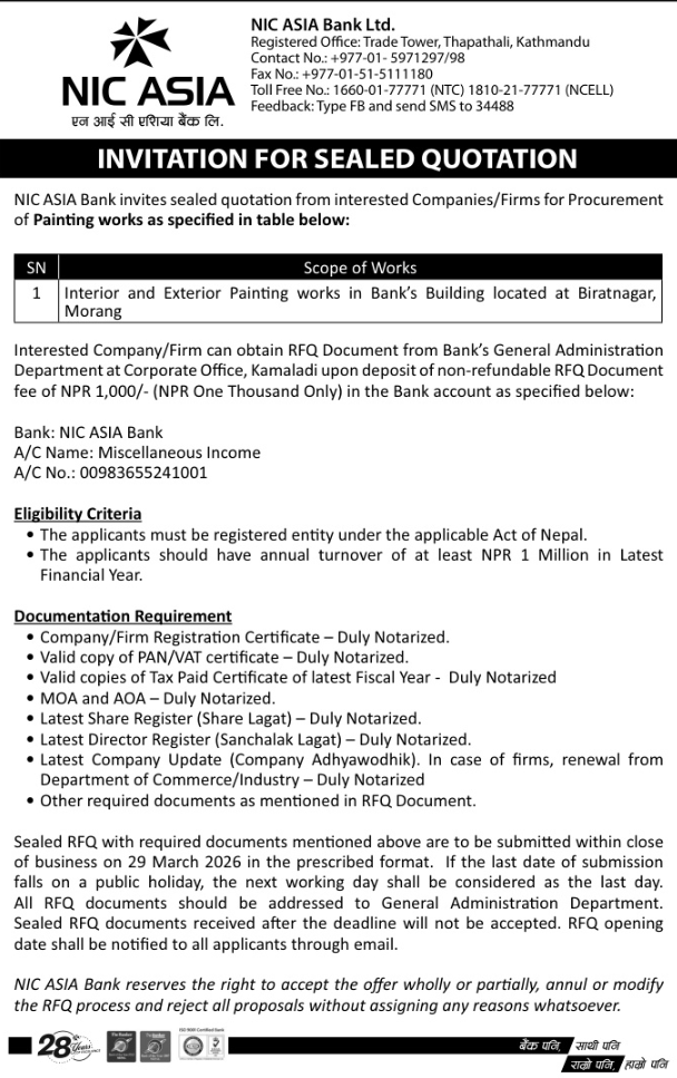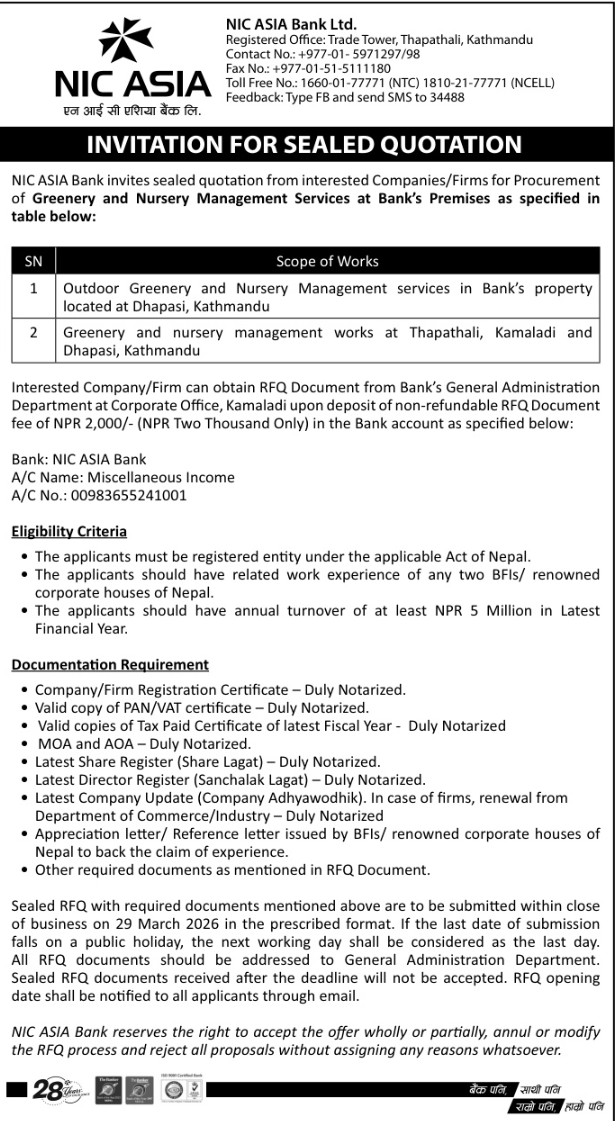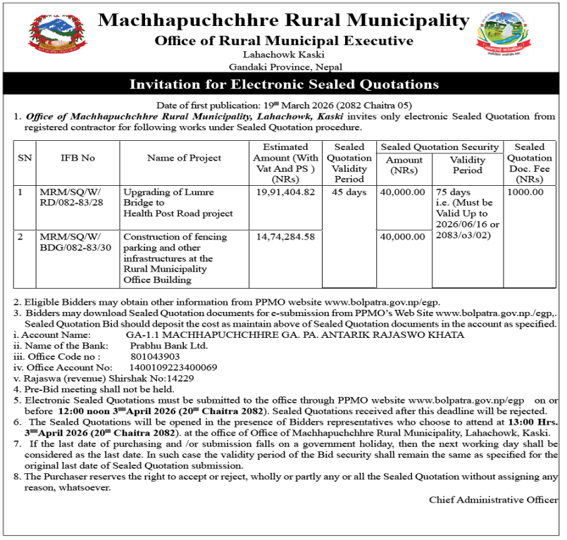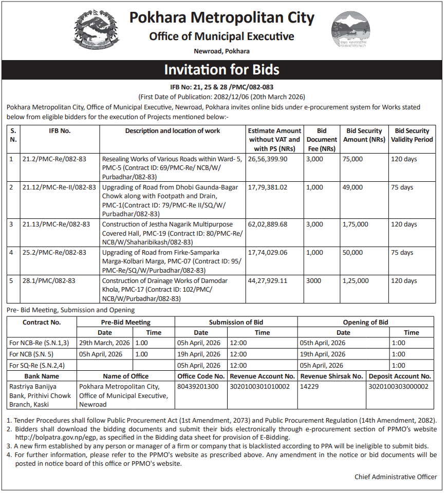 | 18 | Pokhara Metropolitan City Office | Resealing Works of various roads within ward 5 , PMC - 5 (Contract ID: 69/PMC-Re/NCB/W/Purbadhar/082-83) | 20/03/2026 | PPMO | 05/04/2026 | Click Here | |