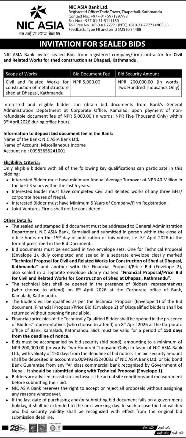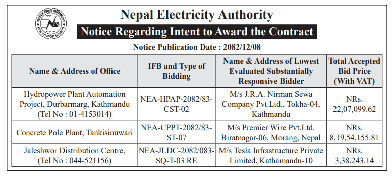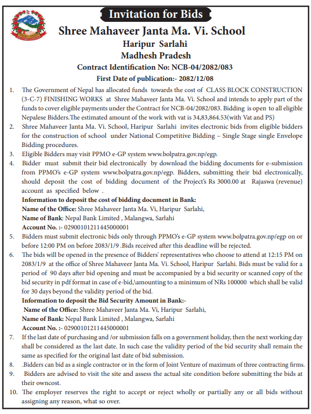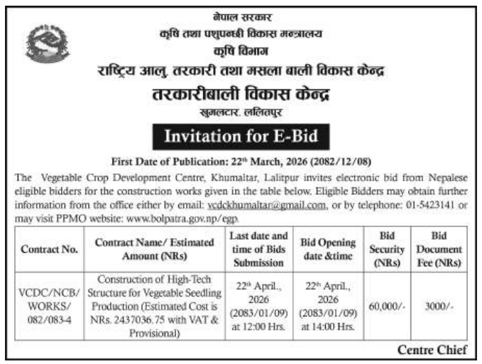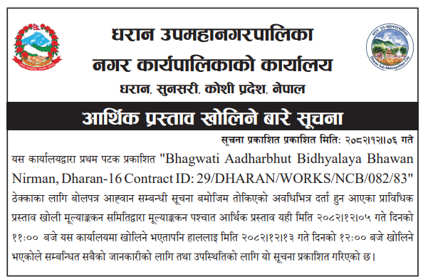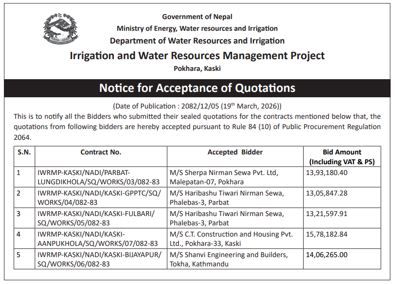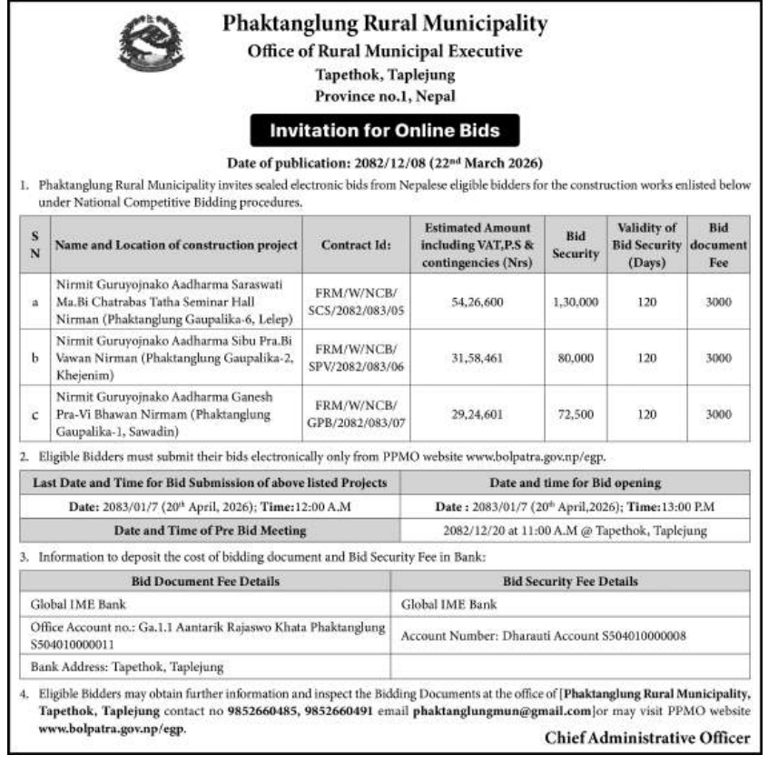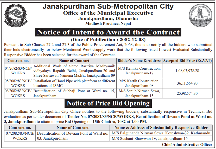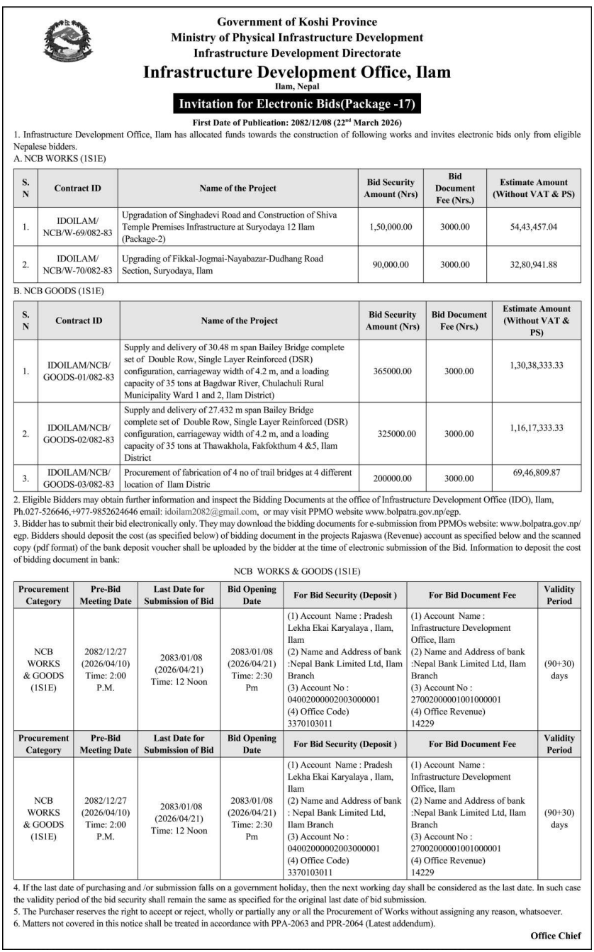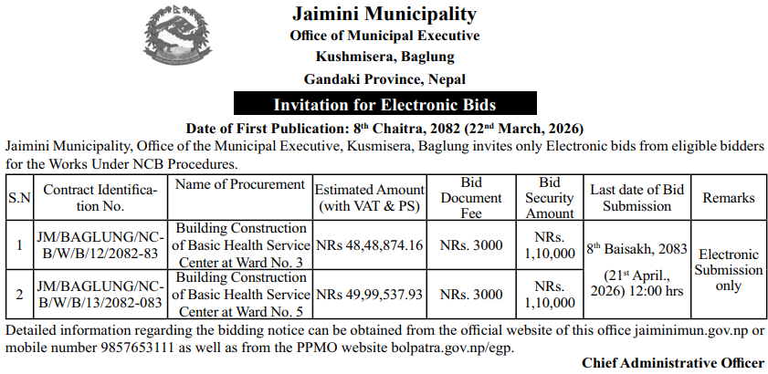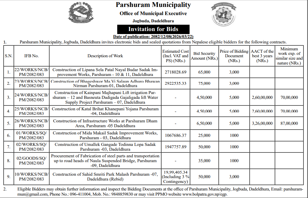 | 17 | Pokhara Metropolitan City Office | Construction of Jestha Nagarik Multipurpose Covered Hall, PMC - 19 (Contract ID:80/PMC-Re/NCB/W/Sharibikash/082-83) | 20/03/2026 | PPMO | 05/04/2026 | Click Here | |