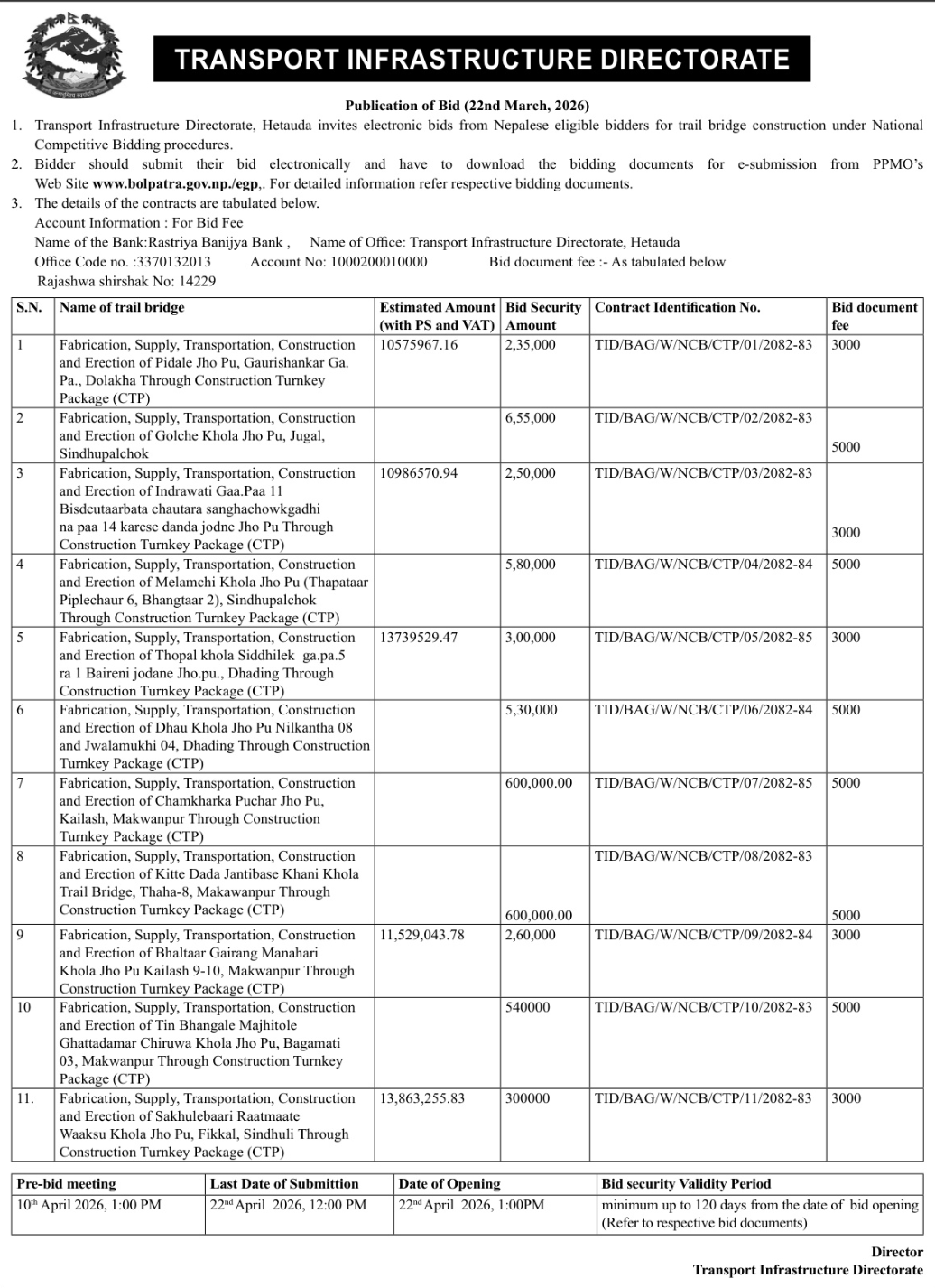 | 203 | Infrastructure Development Office, kawasoti, Nawalparasi(Bardaghat Susta East), Gandaki Province | Improvement of Tripureshwar Masanghat Marg, Krishi Marga Sitaltole Itabhatti Belbas Road, Budda Chok Dekhi Sanjumarga Hudai Nagartandi Sadak, Beldihapul Dekhi Uttar Jane Sadak Gaidakot:17, 15, 14, 12 | 20/03/2026 | PPMO | 19/04/2026 | Click Here | |