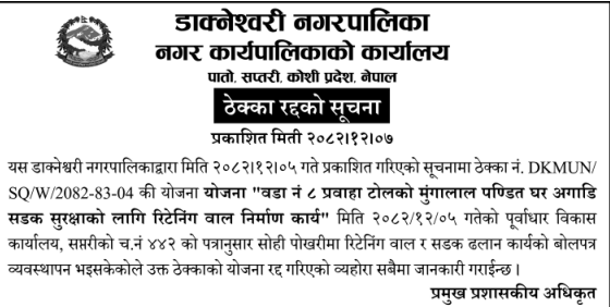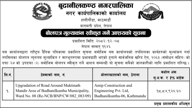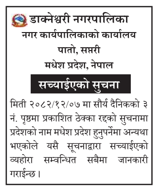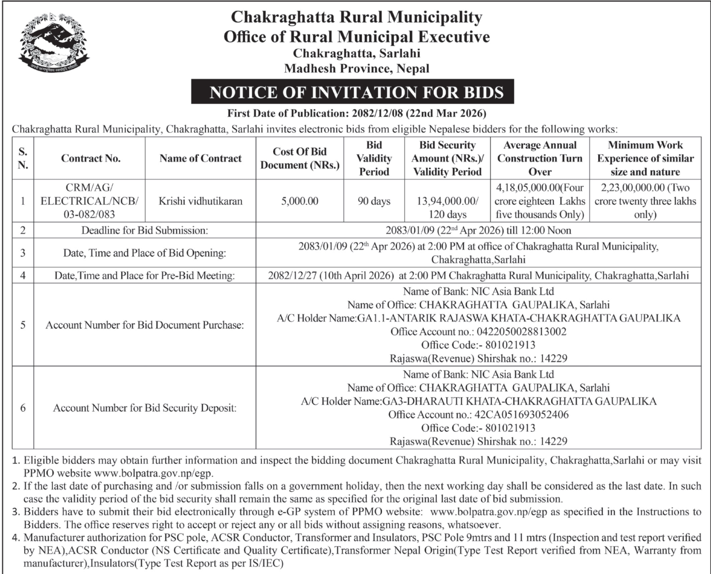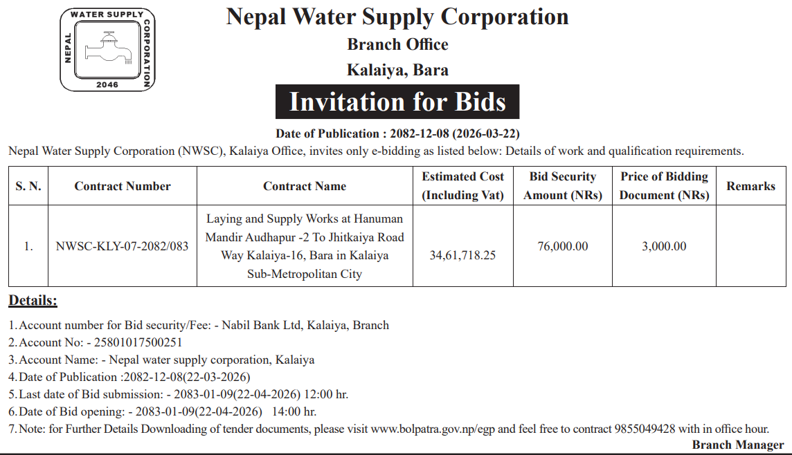 | 166 | kalika Municipality Office , Chitwan | Madan Asrit Dekhi Pakshim Kabita Neupane Ko Gharchowk Bato Kalopatrey, Kalika -4 | 20/03/2026 | PPMO | 19/04/2026 | Click Here | |