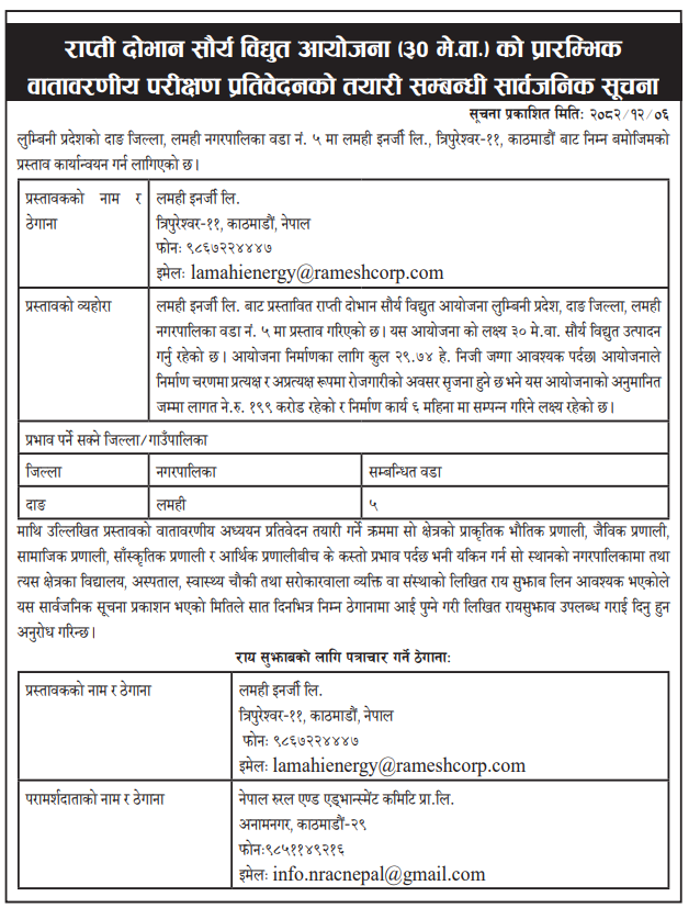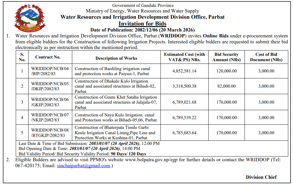 | 152 | Water Supply, Irrigation & Energy Development Office, Dailekh | Construction of Canal Lining,Pipe Line and Protection Works at Bhaterpata Timile Garbi Keule Irrigation Project, Kushma-01, Parbat | 20/03/2026 | PPMO | 20/04/2026 | Click Here | |
