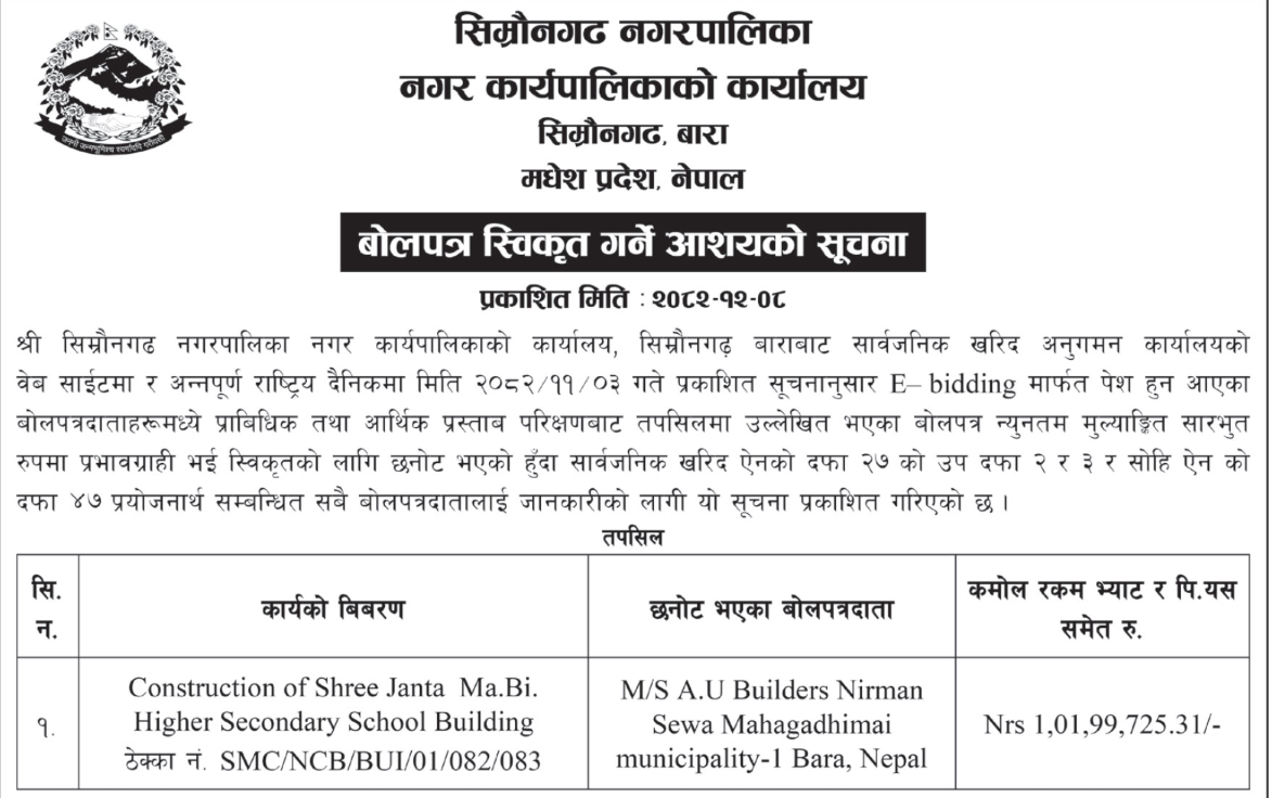 | 32 | Shitaganga Municipality | Simalpani Sanakisan Krisi Tatha Pasu Sahakari Sastha Adhuro Bhawan Nirman Si.Na.Pa.-13 | 20/03/2026 | PPMO | 05/04/2026 | Click Here | |