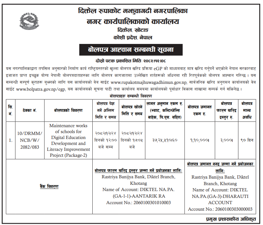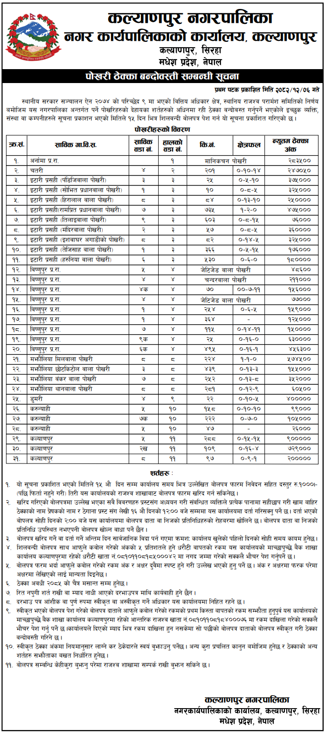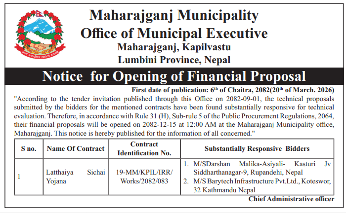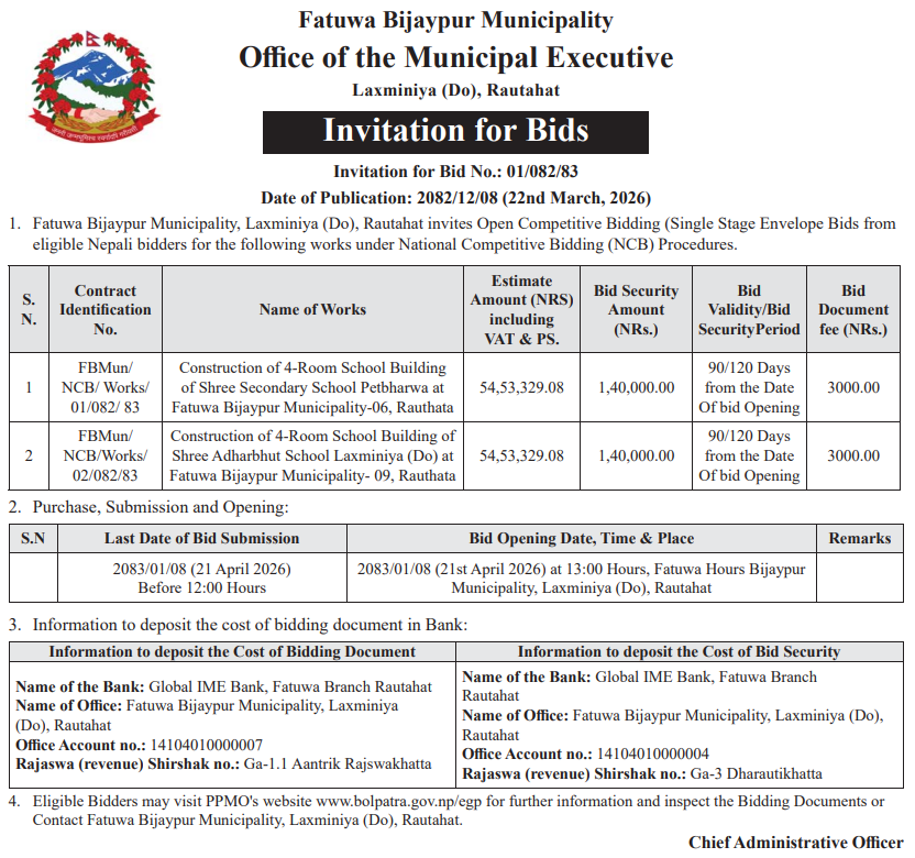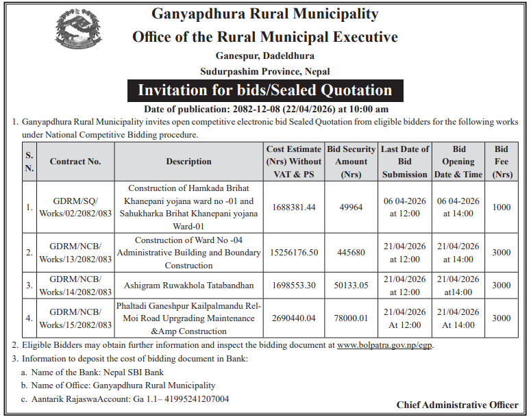 | 14 | Banganga Municipality Office | Siuti Adhuro Vawan, Ward 3 | 20/03/2026 | PPMO | 05/04/2026 | Click Here | |