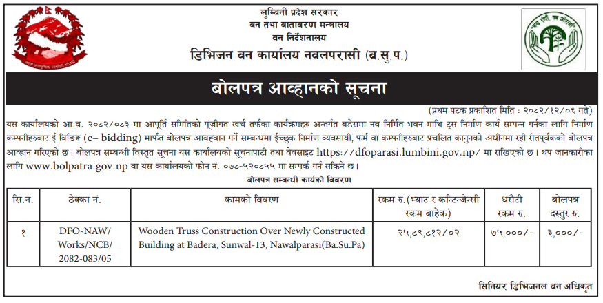 | 187 | Division Forest Office, Nawalparasi (Ba.Su.Pa) | Wooden Truss Construction Over Newly Constructed Building at Badera, Sunwal-13, Nawalparasi(Ba.Su.Pa) | 20/03/2026 | PPMO | 19/04/2026 | Click Here | |