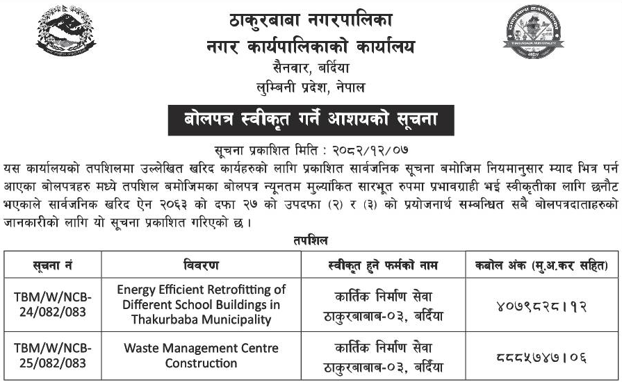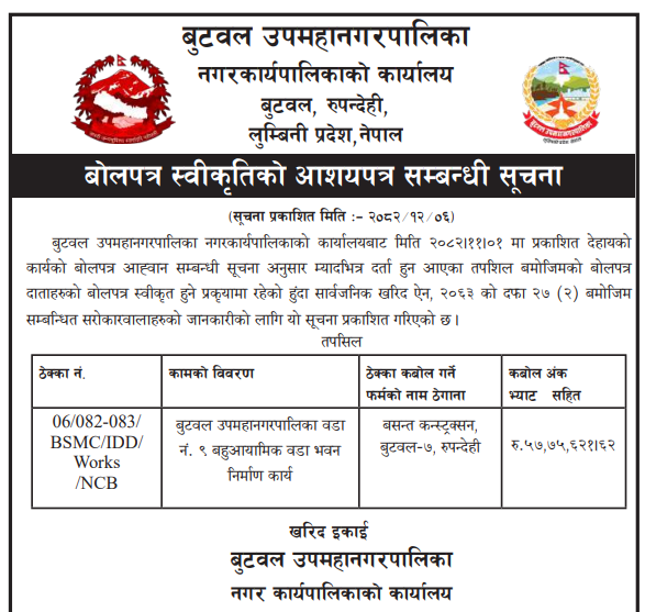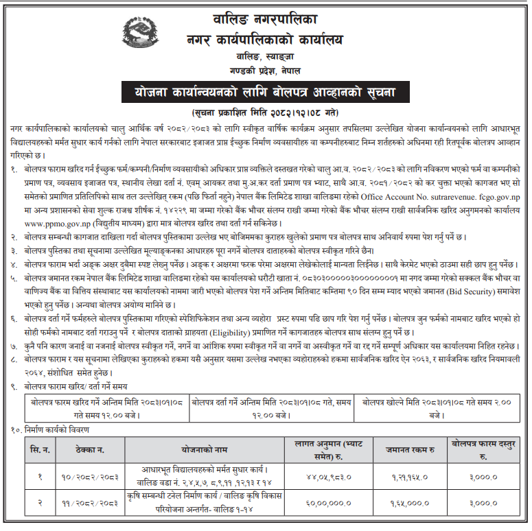 | 12 | Banganga Municipality Office | Bhalwad Adhuro Covered Hall, Ward 9 | 20/03/2026 | PPMO | 05/04/2026 | Click Here | |