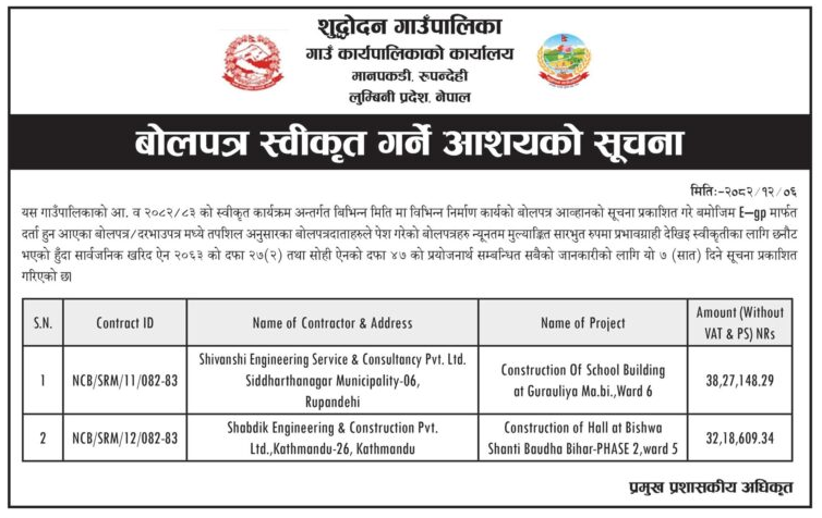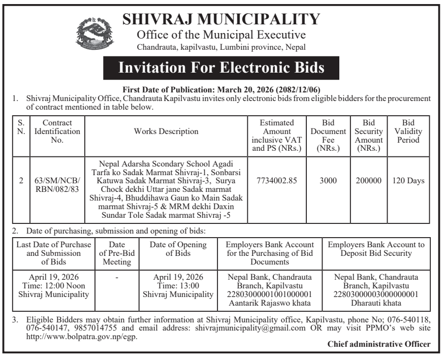 | 177 | Shivraj Municipality, Office of the Municipal Executive, Chandrauta kapilvastu | Nepal Adarsha Scondary School Agadi Tarfa ko Sadak Marmat Shivraj -1, Sonbarsi Katuwa Sadak Marmat Shivraj -3, Surya Chock dekhi Uttar jane Sadak marmat Shivraj -4, Bhuddihawa Gaun ko Main Sadak marmat Shivraj -5 & MRM dekhi Daxin Sundar Tole Sadak marmat Shivraj -5 | 20/03/2026 | PPMO | 19/04/2026 | Click Here | |