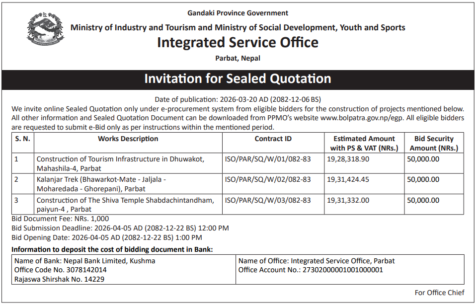 | 217 | kankai Municipality | Construction of Kushma Municipality Ward no. 12 Office Building Kushma-12, Parbat | 20/03/2026 | PPMO | 19/04/2026 | Click Here | |