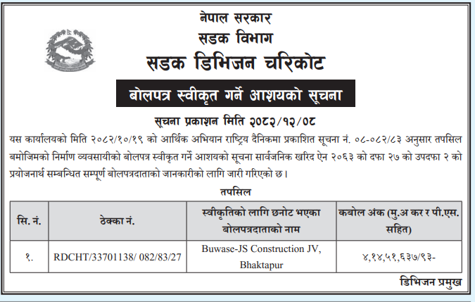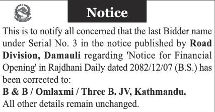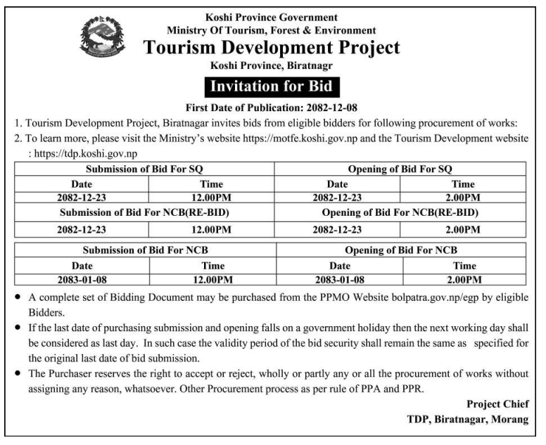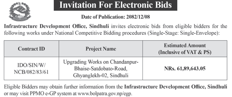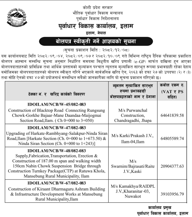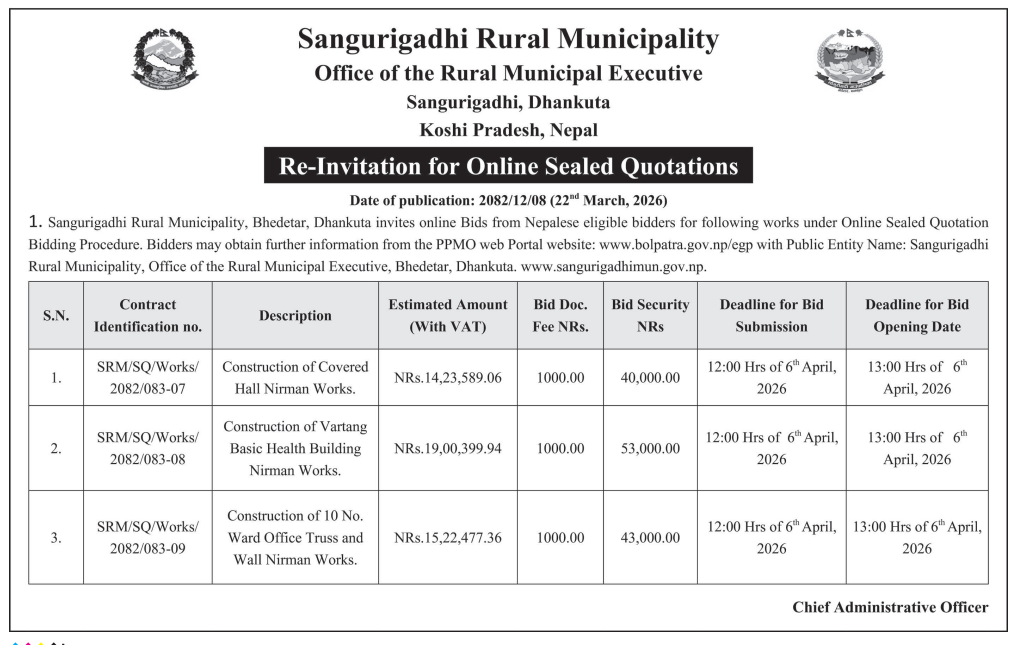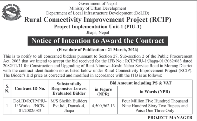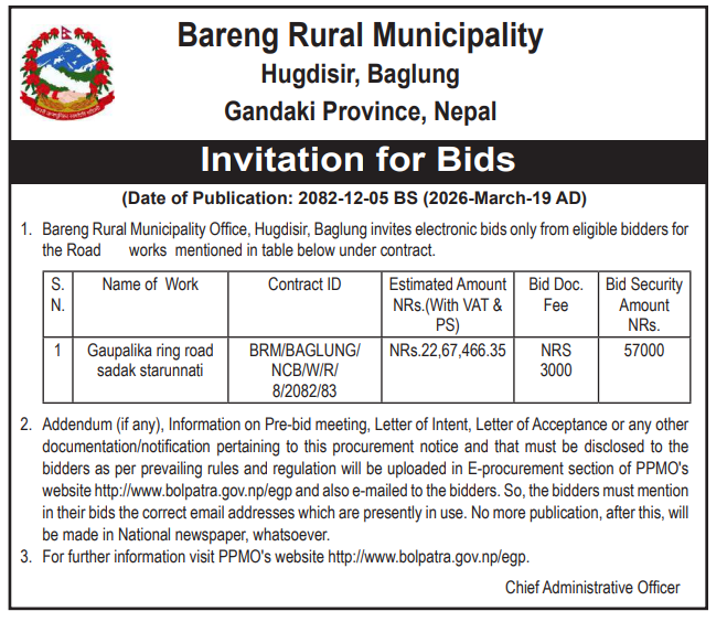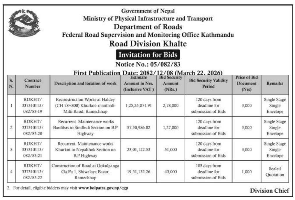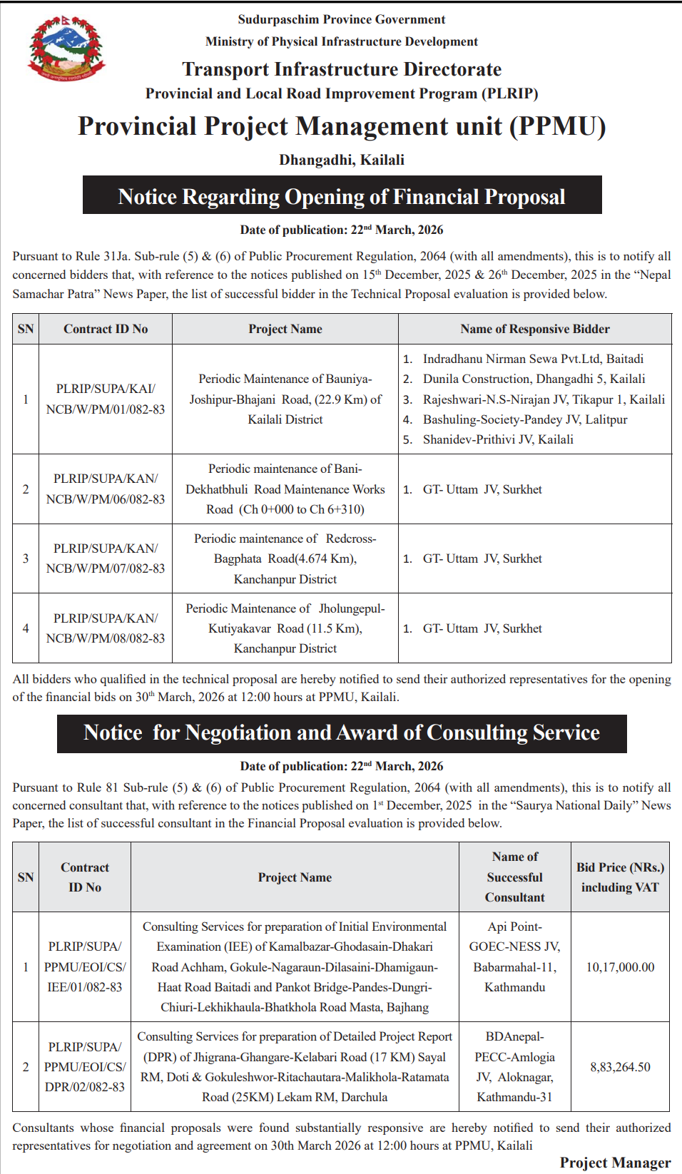 | 4 | Sundarharaicha Municipality | Blacktopped Road Maintenance Works, Belepur-Sukrabare Road, Sundarharaincha 11 and 12 | 20/03/2026 | PPMO | 19/04/2026 | Click Here | |