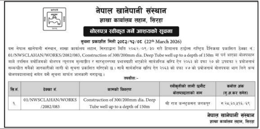 | 169 | kalika Municipality Office , Chitwan | DTH Deep Tubewell Construction At Different ward 3,4 and 7 OF Kalika Municipality (first Phase) | 20/03/2026 | PPMO | 19/04/2026 | Click Here | |