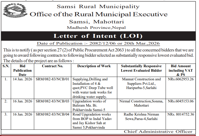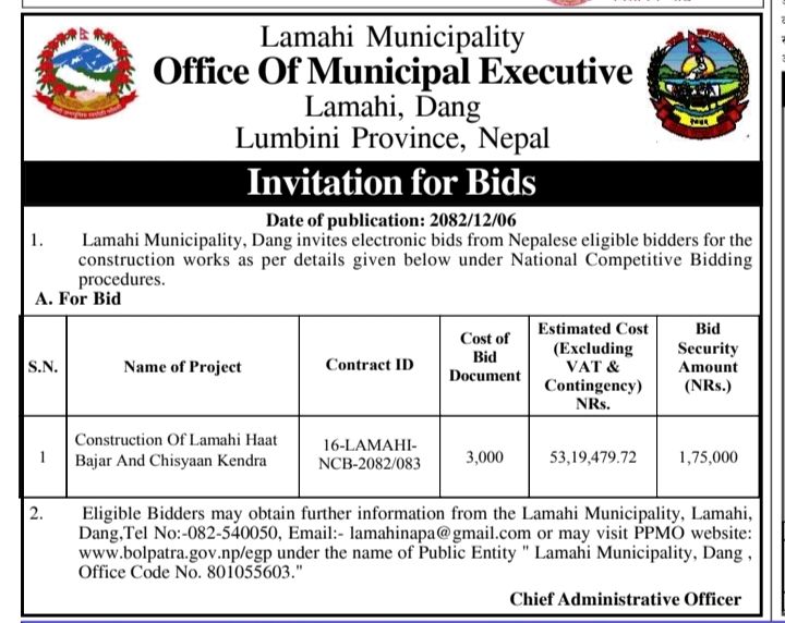 | 159 | Lamahi Municipality Office | Construction Of Lamahi Haat Bajar And Chisyaan Kendra | 20/03/2026 | PPMO | 19/04/2026 | Click Here | |