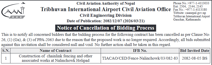 | 48 | Office of CIAA, Kanchanpur | Construction of Boundary Wall at CIAA Office Building ,Kanchanpur | 20/03/2026 | PPMO | 05/04/2026 | Click Here | |
