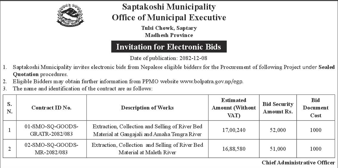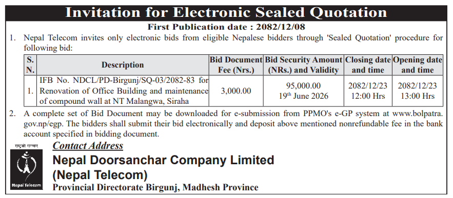| 182 | Birtamode Municipality, Office of Municipal Executive, Birtamod Jhapa | Construction and Maintenance of Various Infrastructure within Birtamode Municipality, Ward No. 01, 02 and 09, Jhapa | 20/03/2026 | PPMO | 19/04/2026 | Click Here | |