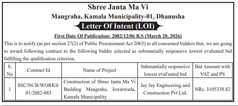 | 142 | Infrastructure Development Office, Dhanusha | Construction of Building of Nirman Bewasai Sangh, Janakpurdham-04 | 20/03/2026 | PPMO | 20/04/2026 | Click Here | |