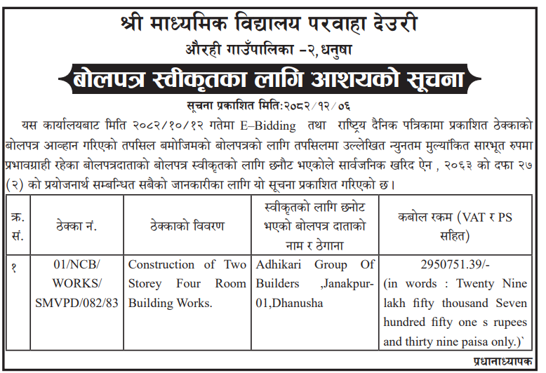 | 160 | Gadhawa Gaupalika | Construction os school building Gadhawa-01 Ransing. | 20/03/2026 | PPMO | 19/04/2026 | Click Here | |