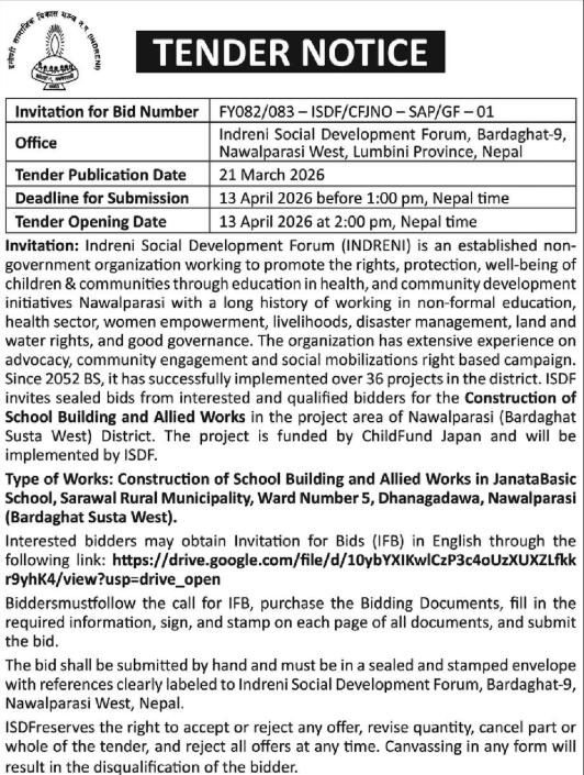 | 143 | Infrastructure Development Office, Dhanusha | Construction of Building of Nirman Bewasai Sangh, Janakpurdham-04 | 20/03/2026 | PPMO | 20/04/2026 | Click Here | |