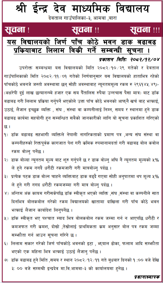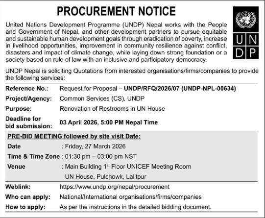 | 229 | FPIU, RUPANDEHI | Repair/Reconstruction/Restoration Work of Pradesh Pramukh Office, Lumbini Province Damaged during the Gen-Z movement as per the Study Report | 20/03/2026 | PPMO | 19/04/2026 | Click Here | |